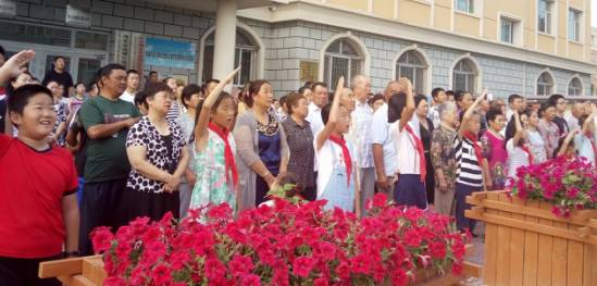 发声亮剑!村里来加入升国旗典礼的暑期学生们也喊着“我也要像姐姐一样发生亮剑”。只要平易近族连合?